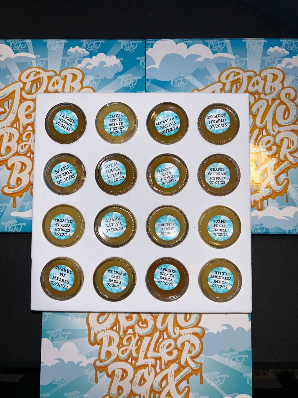 The terpene profile of the Dab Jesus Diamond Baller Box varies by strain but often includes Myrcene, Limonene, Caryophyllene, and Pinene. These terpenes enhance the flavor and therapeutic benefits of the concentrate, offering a unique and rich sensory experience.