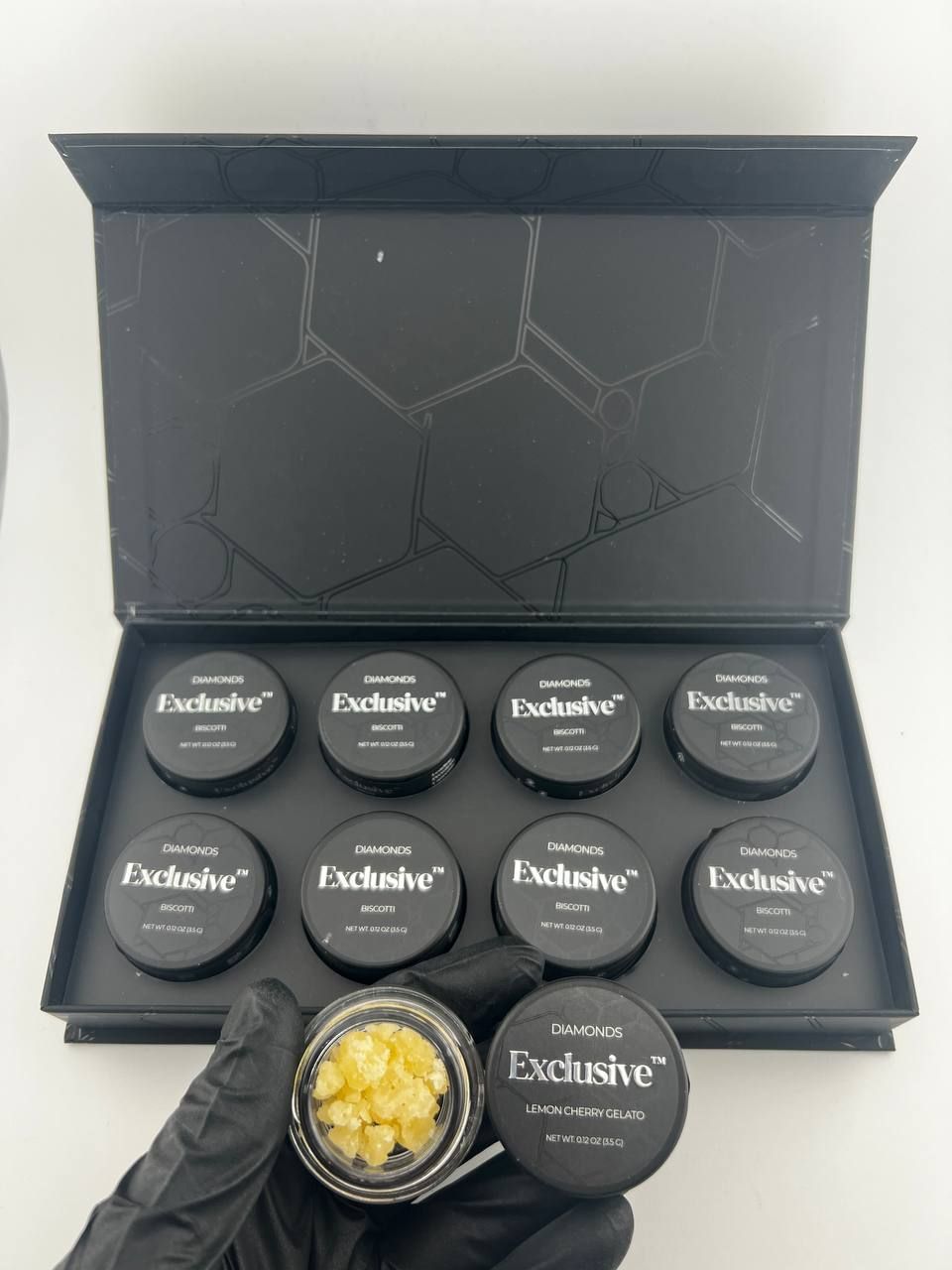 The terpene profile of Exclusive Diamonds varies by strain but often includes Limonene, Myrcene, Caryophyllene, and Pinene. These terpenes enhance the flavor and therapeutic benefits of the concentrate, offering a unique and rich sensory experience.